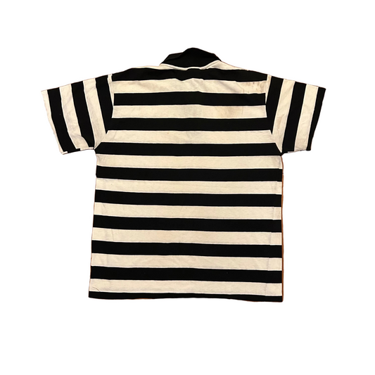 90's Campus American Action Gear Black White Horizontal Striped Polo Collared Tshirt - Medium - 21" x 27"