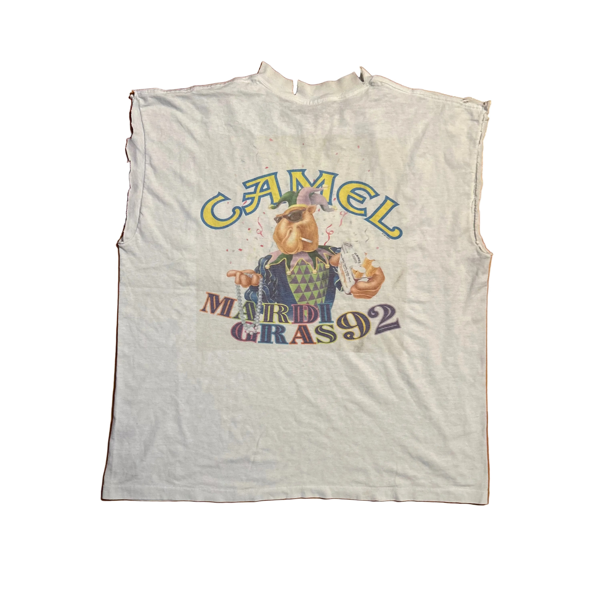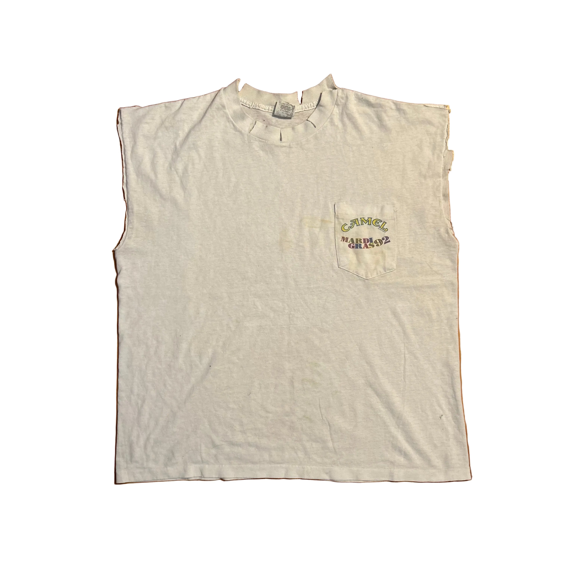 90's Camel Cigarettes Mardi Gras 1992 White Cutoff Tank Top Pocket Shirt - Large - 23" x 26.5"