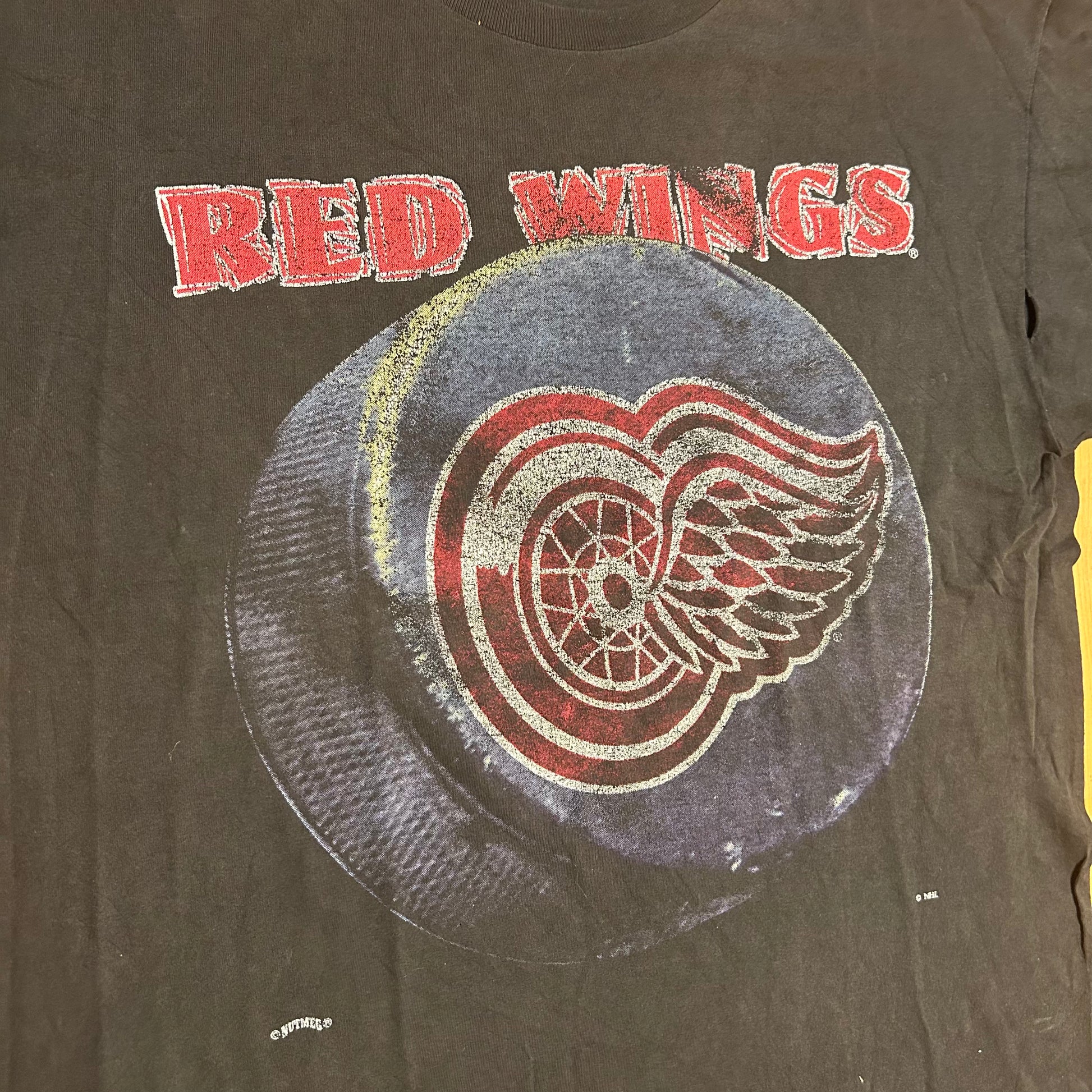 90/00’s Nutmeg Mills Detroit Red Wings Hockey NHL Black Grey Faded Cotton Tshirt - XLarge - 24" x 31"